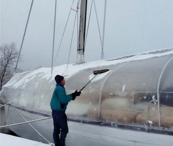 Next we considered the effects of snow. An average snowfall of 81 inches is a lot. We were told that it mostly would be light and fluffy, but that the spring snows were often wet and heavy. Collapsed boat covers are common, but to keep the snow, ice, and wind off the deck, we needed some kind of cover. Because this was a one-season project, shrink-wrap seemed the obvious solution. We chose clear wrap to let in more light and create a greenhouse effect when the sun was out.