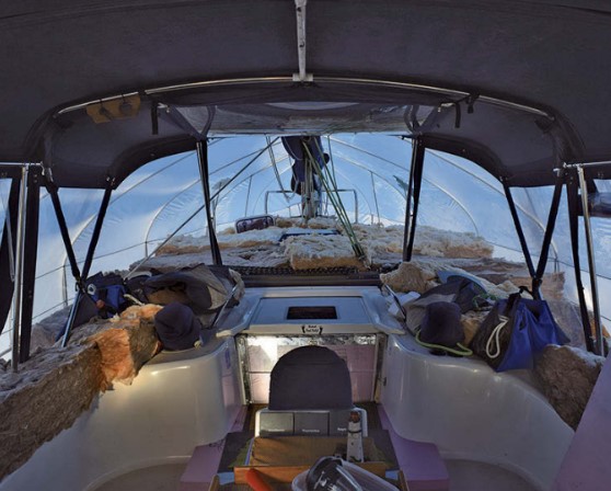 The shrink-wrap was integral to our design. Once the deck was sealed from the rain, I was able to stack pieces of 10-inch-thick fiberglass insulation to cover the whole deck. This was R-30+, and we could move it out of the way when we needed to fill the water tanks. When the weather was not too cold, we stacked the pieces so sunlight could get below through the ports and hatches.