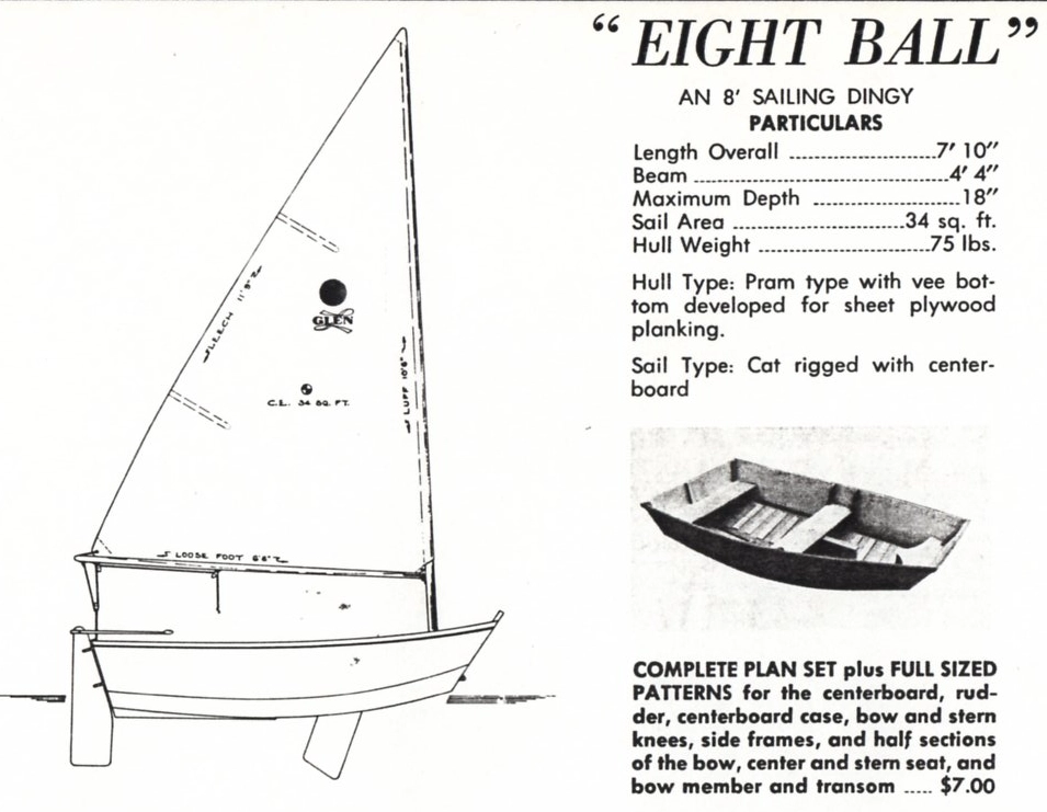 The Glen-L Eight Ball, a compact 7-foot 10-inch pram dinghy designed by Glen L. Witt in the 1950s and offered through Glen-L Marine Designs as an entry-level staple, serves as the quintessential first-time boatbuilding project—a versatile tender, rowboat, or sailing pram that's unsinkable, stable, and endlessly adaptable for lakes, ponds, or yacht club use by families, juniors, or solo tinkerers. Measuring 7'10" LOA with a 4-foot beam and 6-inch draft (flat-bottomed for beaching), it displaces a featherweight 65 pounds (with foam flotation for positive buoyancy), making it effortlessly car-toppable, towable by bike, or storable in a hatch; the optional cat-rigged sailing setup deploys a simple sock sail (35 square feet, SA/D ~23) over an unstayed wooden mast for gentle planning at 4–5 knots in 8–12 knots of breeze, while rowing oarlocks or a 2 hp outboard well enable 3–4 knot propulsion.